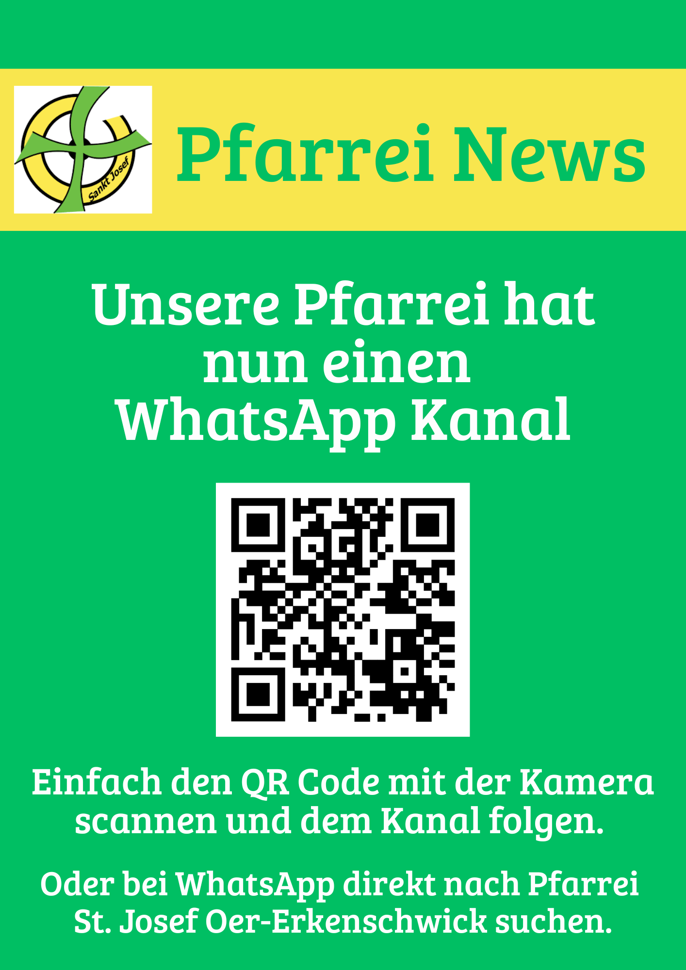 Seit vergangenem Wochenede betreibt der Öffentlichkeitsausschuss der Pfarrei einen WhatsApp Kanal für St. Josef. Auf diesem Weg möchten wir eine größere Menge an Menschen über das Pogramm und Gottesdienste innerhalb der Pfarrei informieren und erreichen. Dies gelingt natürlich nur mit Hilfe der Vereine und Verbände. Falls Sie also Werbung für eine Veranstaltung, oder einen besonderen Gottesdienst machen möchten, dann melden Sie sich gerne bei Ina Engelke oder Ann-Kathrin Müller-Boßle...