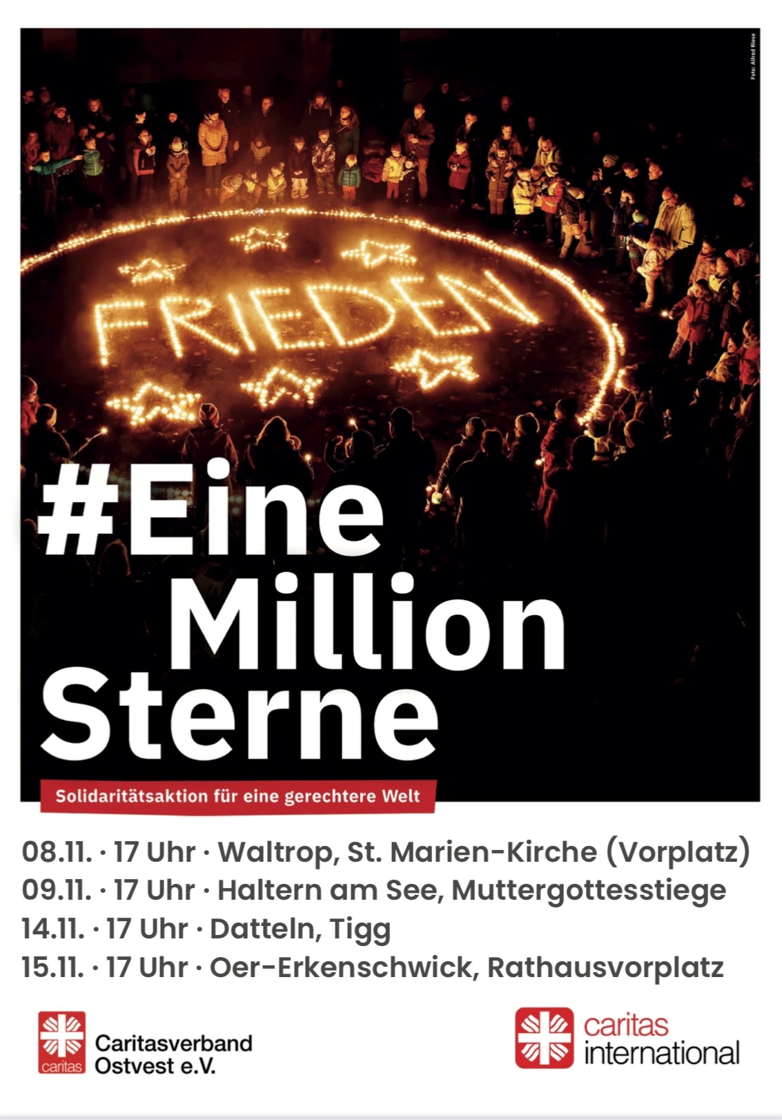 Im November 2025 heißt es wieder: #EineMillionSterne. Zum ersten Mal führt der Caritasverband Ostvest e.V. die bundesweite Solidaritätsaktion von Caritas international an allen vier Verbandstandorten, Haltern, Datteln, Oer-Erkenschwick und Waltrop, durch. Unter dem Motto der Caritas- Jahreskampagne „Türen öffnen – da kann ja jeder kommen“ sollen die Kerzen europaweit und auch vor Ort Hoffnung schenken und Solidarität sichtbar machen, besonders für diejenigen, die unsere Unterst...