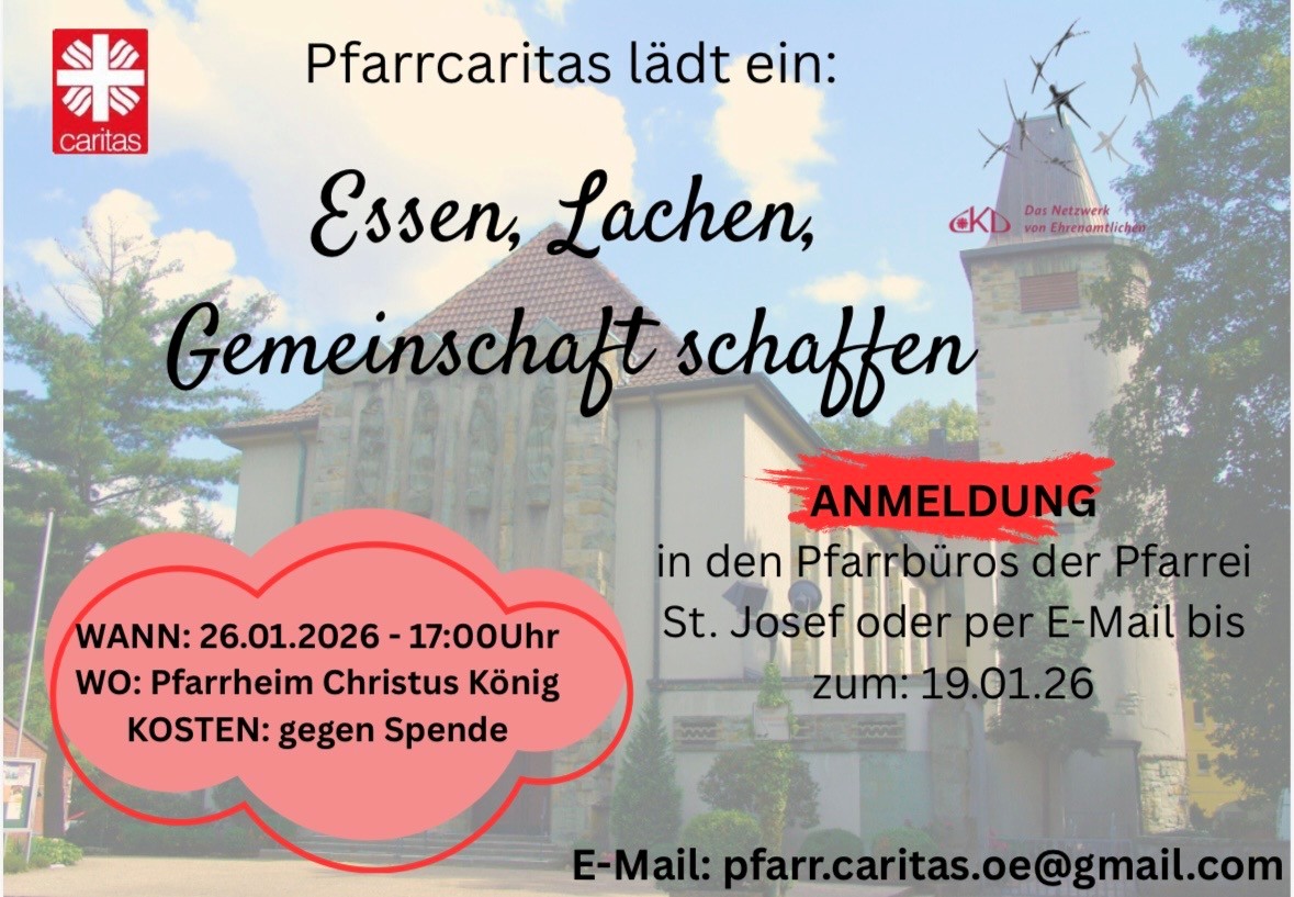 Essen, Lachen, Gemeinschaft schaffen: Die Pfarrcaritas lädt für Montag, 26. Januar 2026, wieder zu „Essen, Lachen, Gemeinschaft schaffen“ ein. Es geht los ab 17.3 0 Uhr im Pfarrheim Christus König. In gemütlicher Runde sind alle Interessierten eingeladen, zusammen zu sitzen und zu genießen. Es wird wieder ein festliches Drei-Gänge-Menü, angeboten. Auch stehen für jeden Geschmack Getränke bereit. Nach dem guten Start zu den ersten beiden gemeinsamen Essen freuen wir uns, auch im komm...