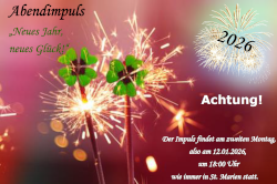 Der erste Montag im neuen Jahr fällt auf den Vortag des Festes der Erscheinung des Herrn, auch als Epiphanie oder volkstümlich „Hl. Drei Könige“ bekannt. Da der Dreikönigstag in NRW kein staatlicher Feiertag ist, findet ein feierlicher Festgottesdienst am Vorabend (05.01.2026) um 18 Uhr in St. Marien statt. Der Abendimpuls mit dem Thema „Neues Jahr, neues Glück!“ verschiebt sich um eine Woche auf den 12.01.2025, 18 Uhr.